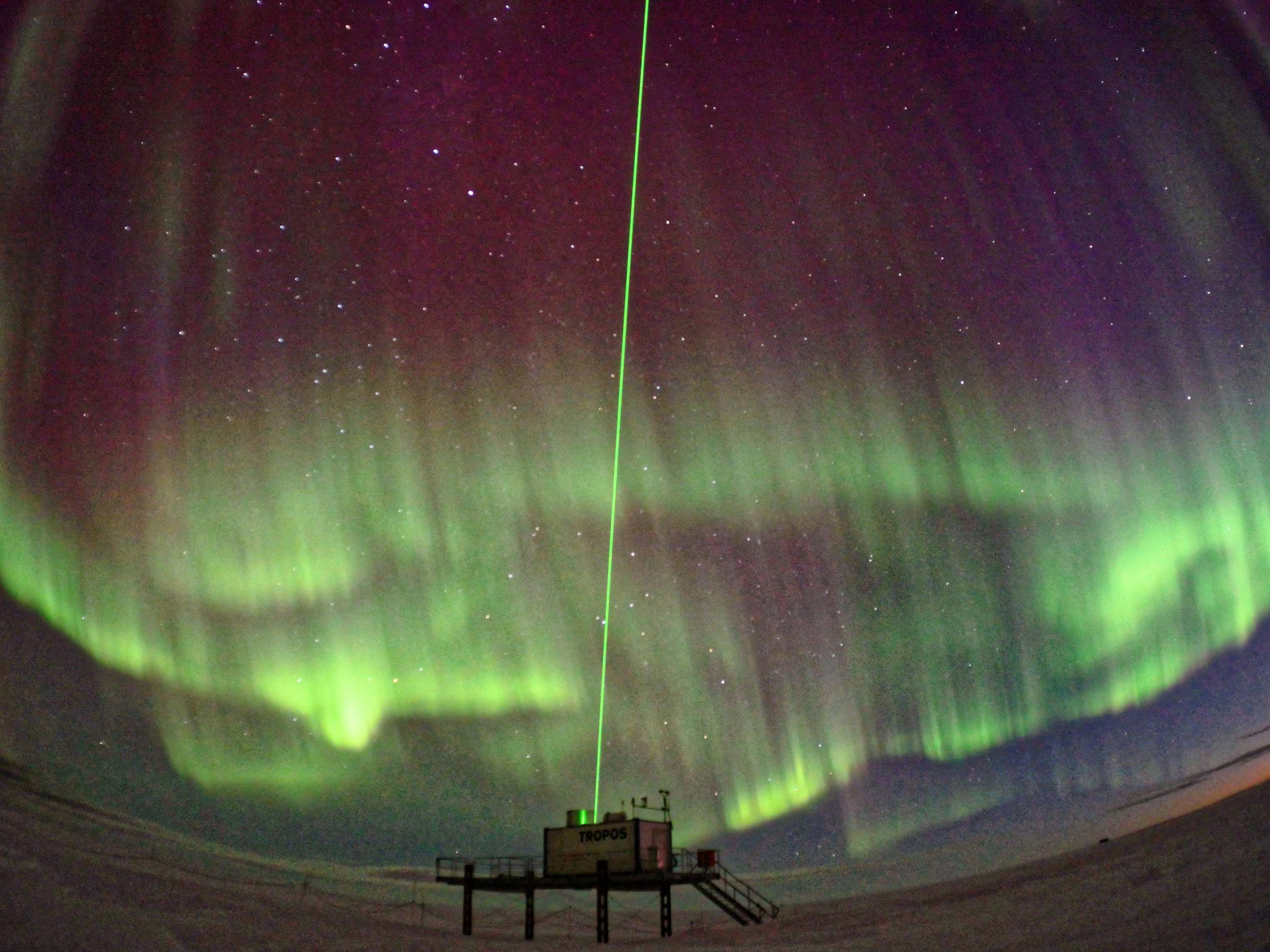 The green laser beam of the multiwavelength lidar, which scanned the atmosphere above Neumayer Station III, was a novelty in this part of Antarctica. A lidar, also known as “light radar,” sends short laser pulses from the ground into the atmosphere and receives the backscattered light with a special receiver. Information about the height, quantity, and type of suspended particles (aerosols) in the atmosphere can be derived from the travel time, intensity, and polarization of the backscattered signals.