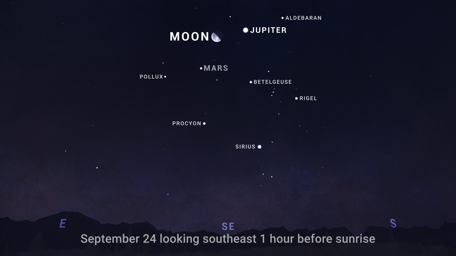 - September 25 – The crescent moon appears near Mars this morning. See them with Jupiter and the bright stars of the winter constellations in the predawn sky.