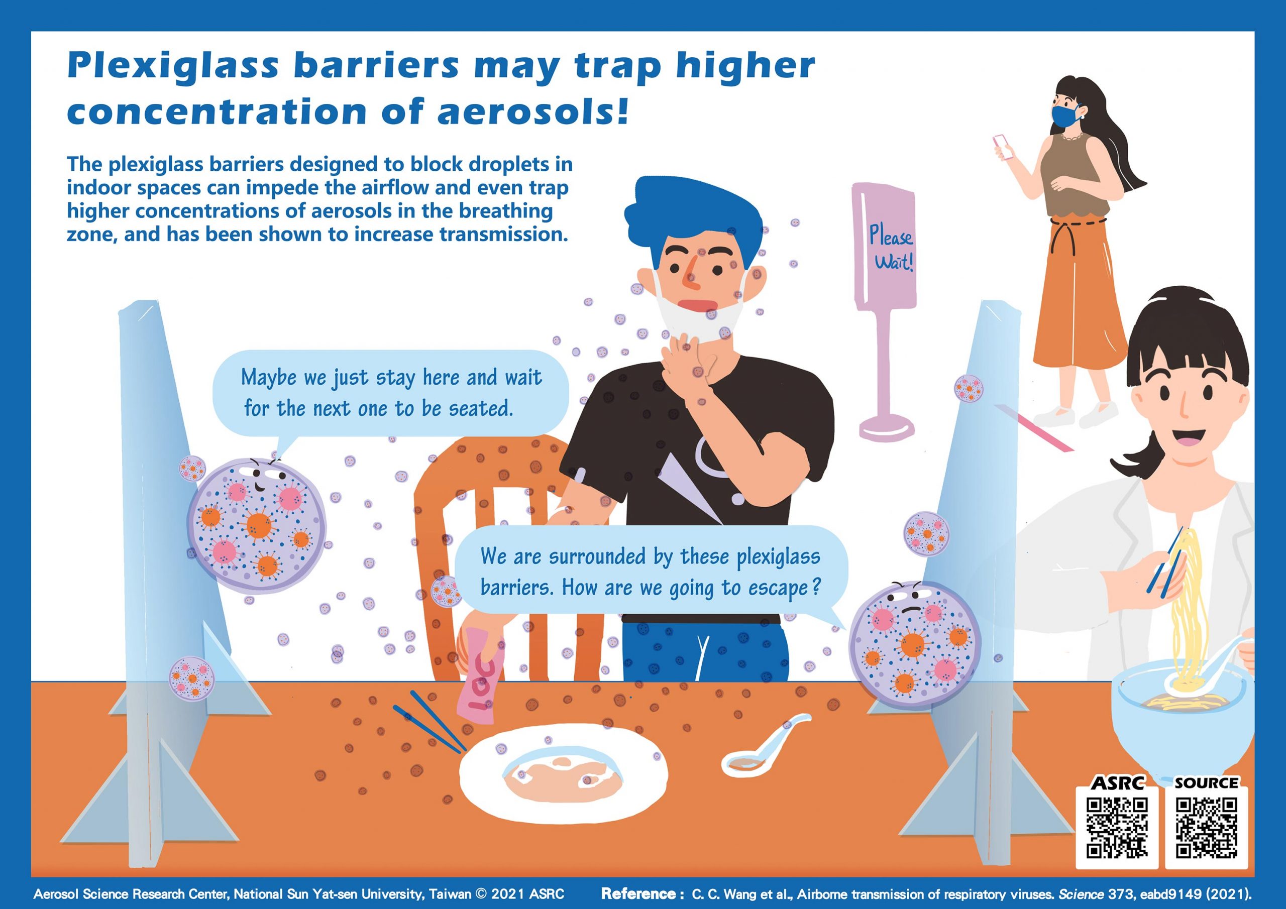 Another distinct behavior of aerosols that should be taken into serious consideration is their capacity to be influenced by airflow and ventilation. Ensuring sufficient ventilation rates, filtration, and avoiding recirculation help reduce airborne transmission of infectious virus-laden aerosols. “Monitoring CO2 with portable meters helps verify that ventilation is sufficient, and implementing portable HEPA (high efficiency particulate air) purifiers and upper room UV disinfection systems also help reduce the concentrations of virus-laden aerosols,” added Jose-Luis Jimenez, an atmospheric aerosol chemist of the University of Colorado Boulder. On the other hand, the plexiglass barriers commonly used to block droplet spray from coughs and sneezes in indoor spaces may “impede proper ventilation and create higher exposures for some people,” said Linsey Marr of Virginia Tech, who has studied airborne transmission of pathogens for years. “They are not recommended except for brief, face-to-face transactions, but even then, masks are better because they help remove aerosols, while barriers just divert them.”