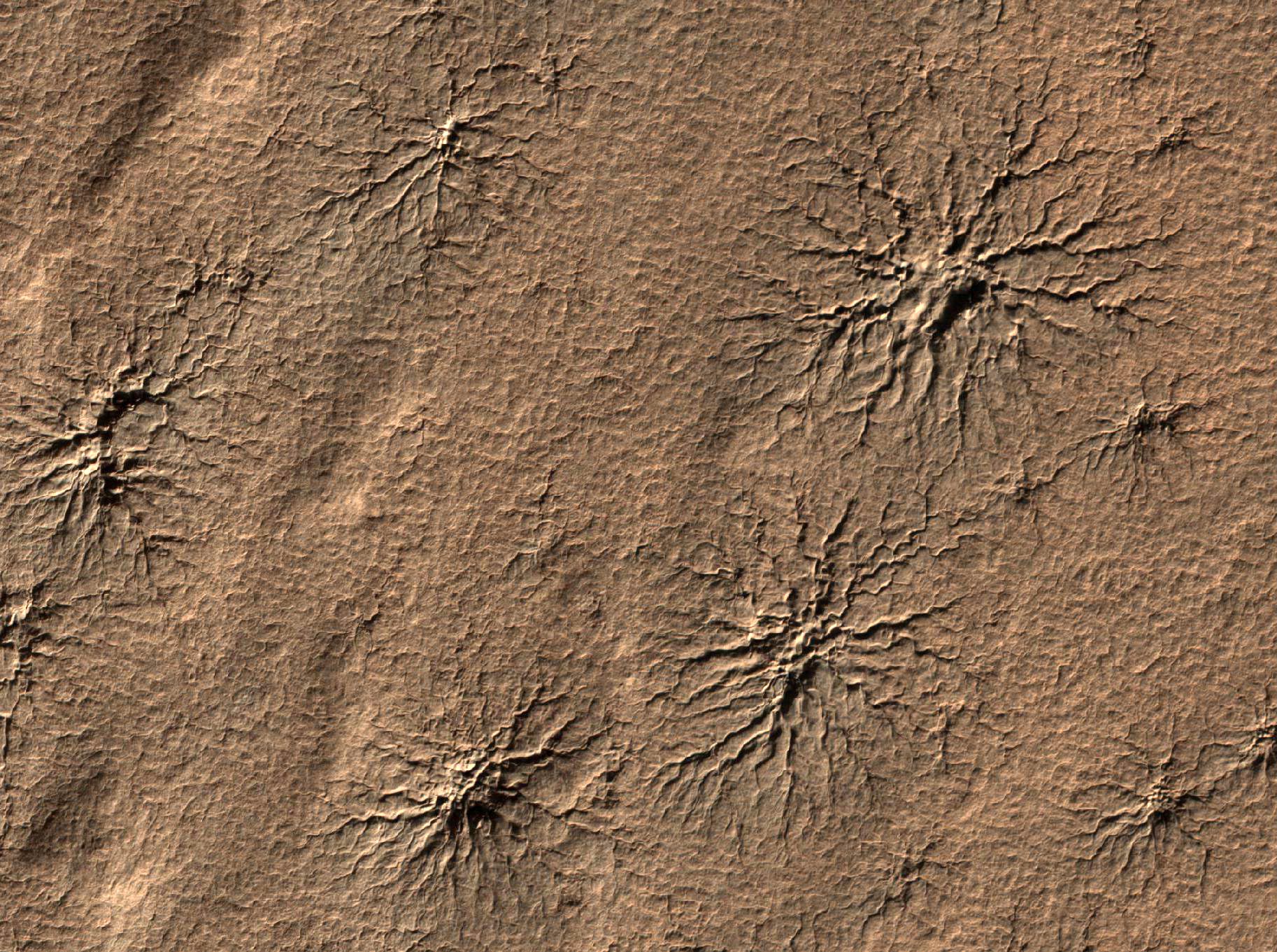 Since discovering them in 2003 via images from orbiters, scientists have marveled at spider-like shapes sprawled across the southern hemisphere of Mars. No one is entirely sure how these geologic features are created. Each branched formation can stretch more than a half-mile (1 kilometer) from end to end and include hundreds of spindly “legs.” Called araneiform terrain, these features are often found in clusters, giving the surface a wrinkled appearance.