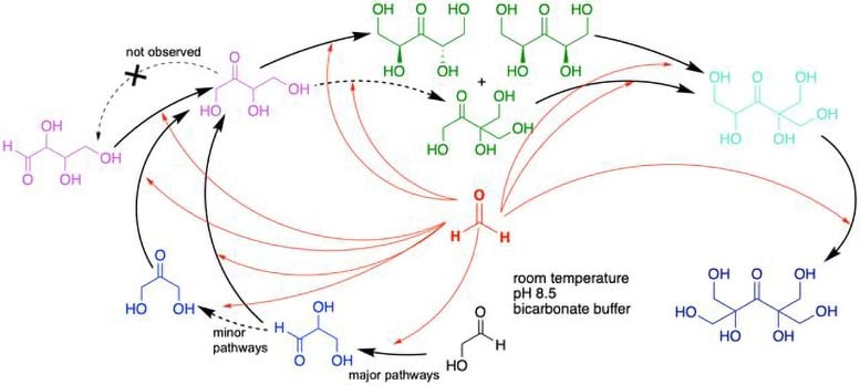 “The reactivity of formaldehyde doesn’t allow you to stop at a particular stage,” says Krishnamurthy. “Even with very mild reaction conditions it goes on until all of the formaldehyde is consumed, which means it’s very difficult to control or stop the reaction in order to form intermediate sugars.”