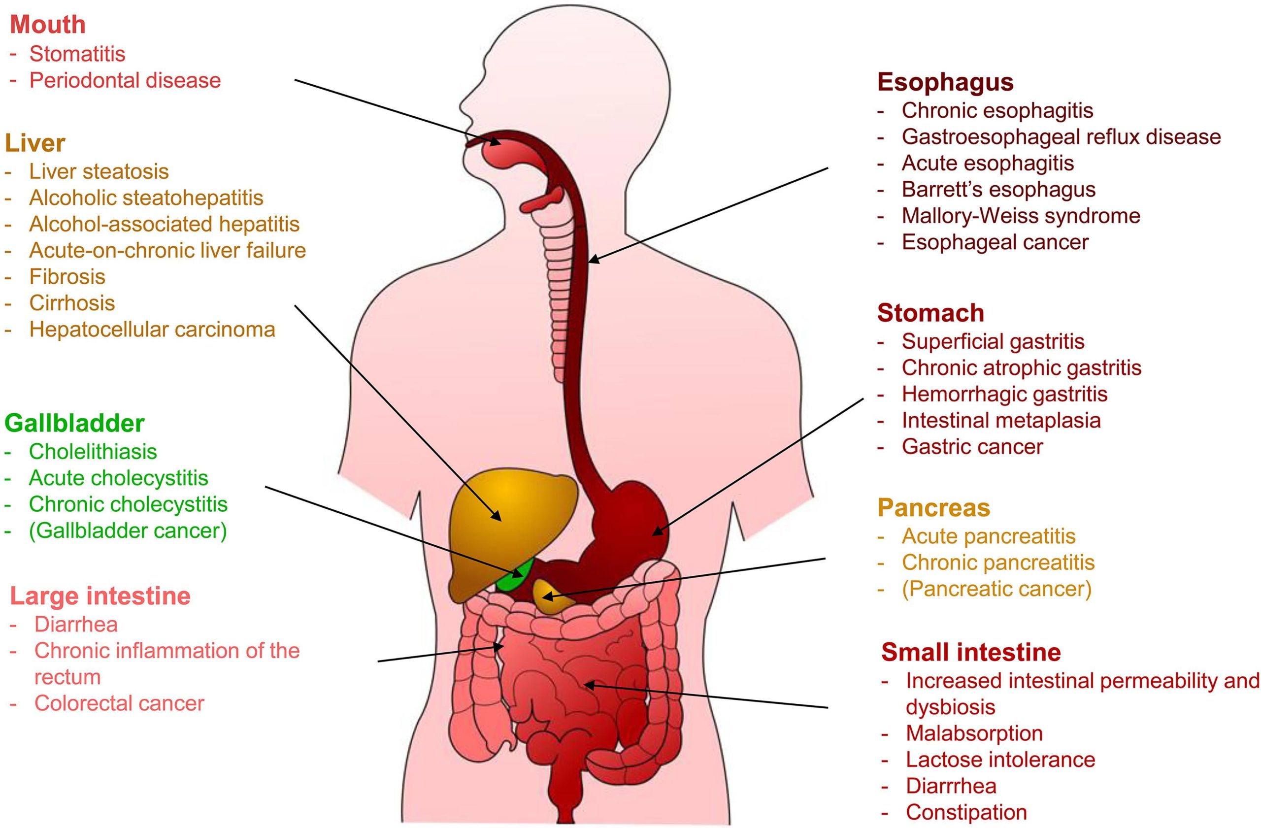 Excessive alcohol consumption is a major public health issue, contributing to 6% of all deaths worldwide and 5.1% of the global disease burden. It is a key risk factor for more than 200 diseases, including liver cirrhosis, pancreatitis, and esophageal cancer, with particularly severe effects on the digestive system. More than half of alcohol-related deaths are linked to gastrointestinal diseases, underscoring the need to understand how alcohol affects digestion. This review explores how the body processes ethanol and how alcohol consumption contributes to diseases affecting the liver, gastrointestinal tract, pancreas, and gallbladder.