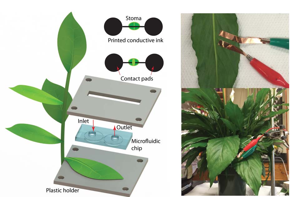 For this study, the researchers tested the sensors on a plant called the peace lily, which they chose in part because it has large stomata. To apply the ink to the leaves, the researchers created a printing mold with a microfluidic channel. When the mold is placed on a leaf, ink flowing through the channel is deposited onto the leaf surface.