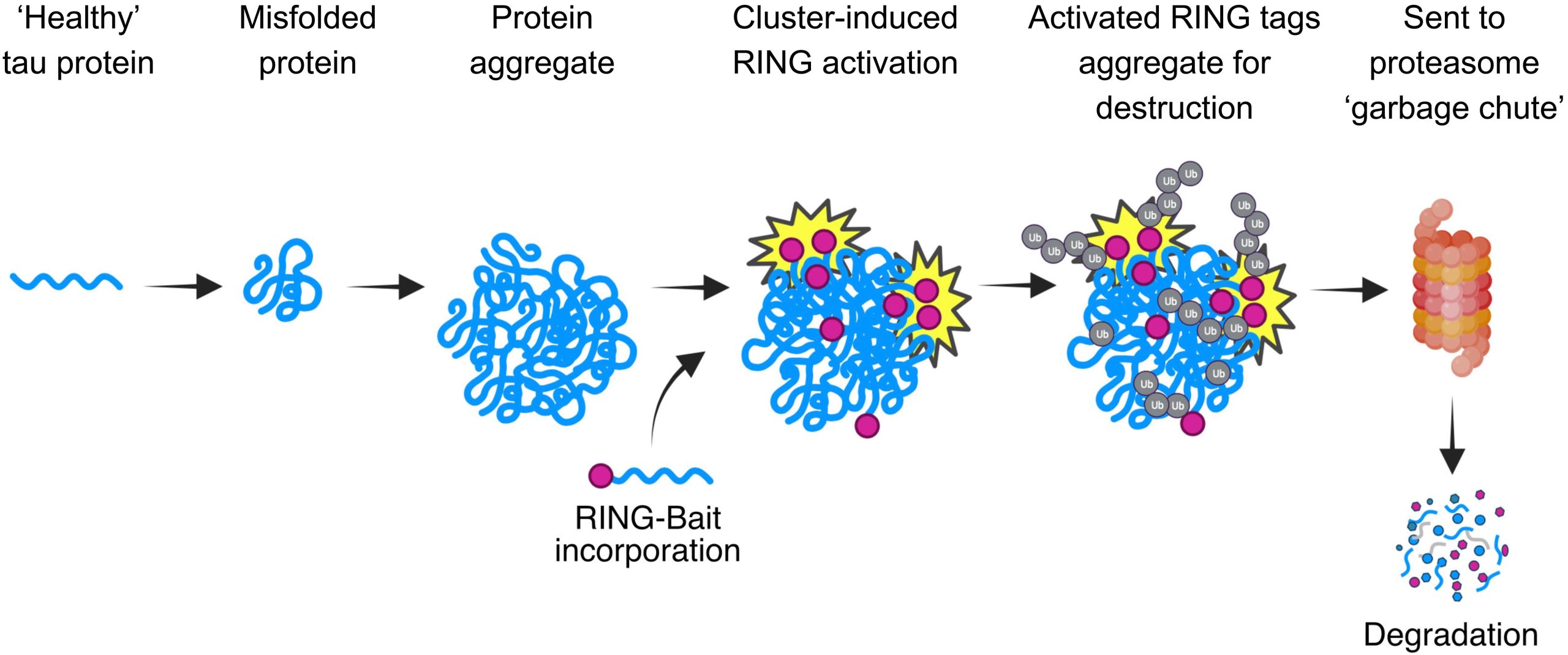 The second therapeutic, ‘RING-Bait’, has the TRIM21 RING joined to a copy of the tau protein itself. The RING-linked tau protein acts as bait – the aggregates incorporate it and TRIM21 RING gets incorporated as well. Once multiple RING-Baits are added to the aggregate, they become activated and cause the entire aggregate to be destroyed.