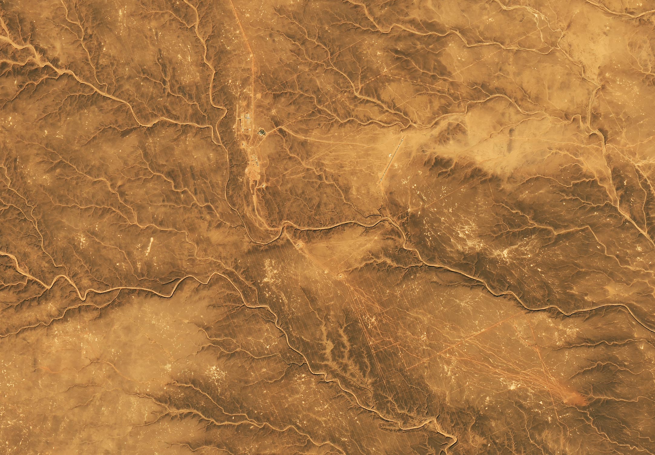 Although the plateau now receives less than 10 millimeters (0.4 inches) of rain annually, clues in the landscape make clear it was once much wetter. Deeply incised dried stream valleys, or wadis, crisscross the plateau, indicating significant past water flow. The small, bright features scattered across the plateau are sand and silt deposits left where water once pooled.