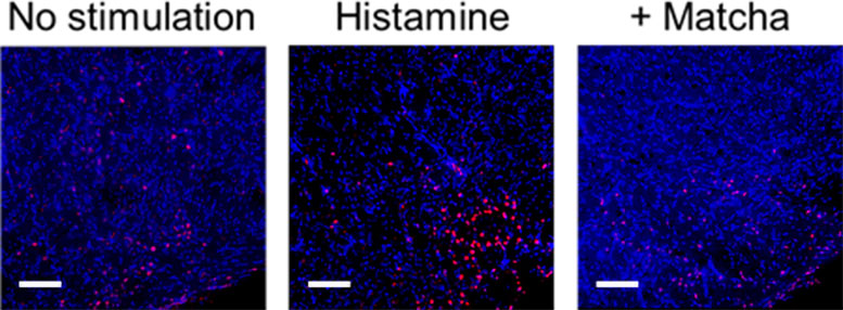 When mice experienced hay fever symptoms, activity of the c-Fos gene rose sharply in this brain region. Treatment with matcha lowered c-Fos expression to nearly normal levels.