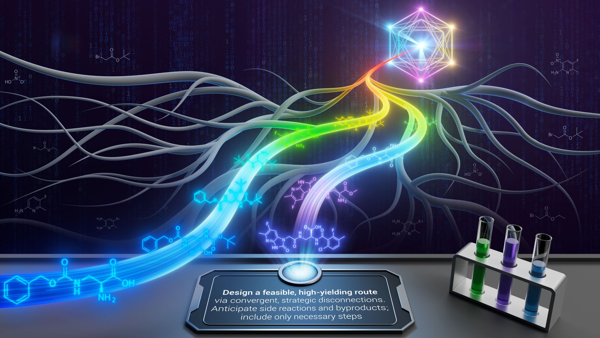 Synthegy starts with a target molecule and a plain language instruction from the user. For instance, a chemist might request that a ring be formed early in the process or that unnecessary protecting groups be avoided. Standard retrosynthesis software then generates many possible reaction routes, which are converted into text and reviewed by the language model.