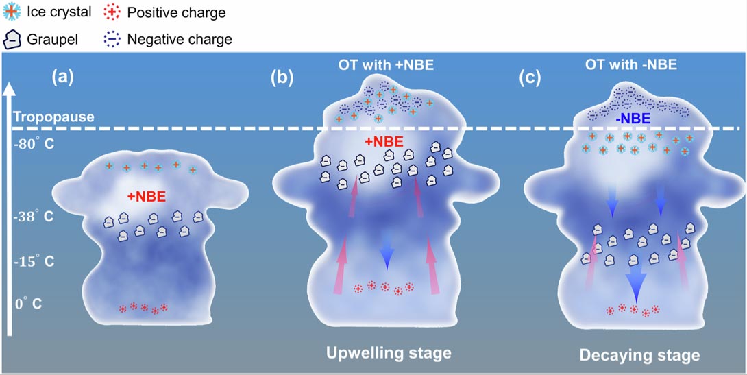 Utilizing an advanced ground-based lightning detection array, the research team observed NBEs during a typhoon on the Chinese coastline, uncovering a robust polarity competition between different NBE types at the cloud top. The findings indicate that positive NBEs occur predominantly during the convective uplift phase at the overshooting top of the cloud, whereas negative NBEs prevail during the convective downdraft phase, typically associated with cirrus plumes in the lower stratosphere. This observation led to the development of a new model suggesting that the intensity of convection modulates the altitude of charged layers within the cloud, which in turn governs the occurrence of cloud-top discharges.
