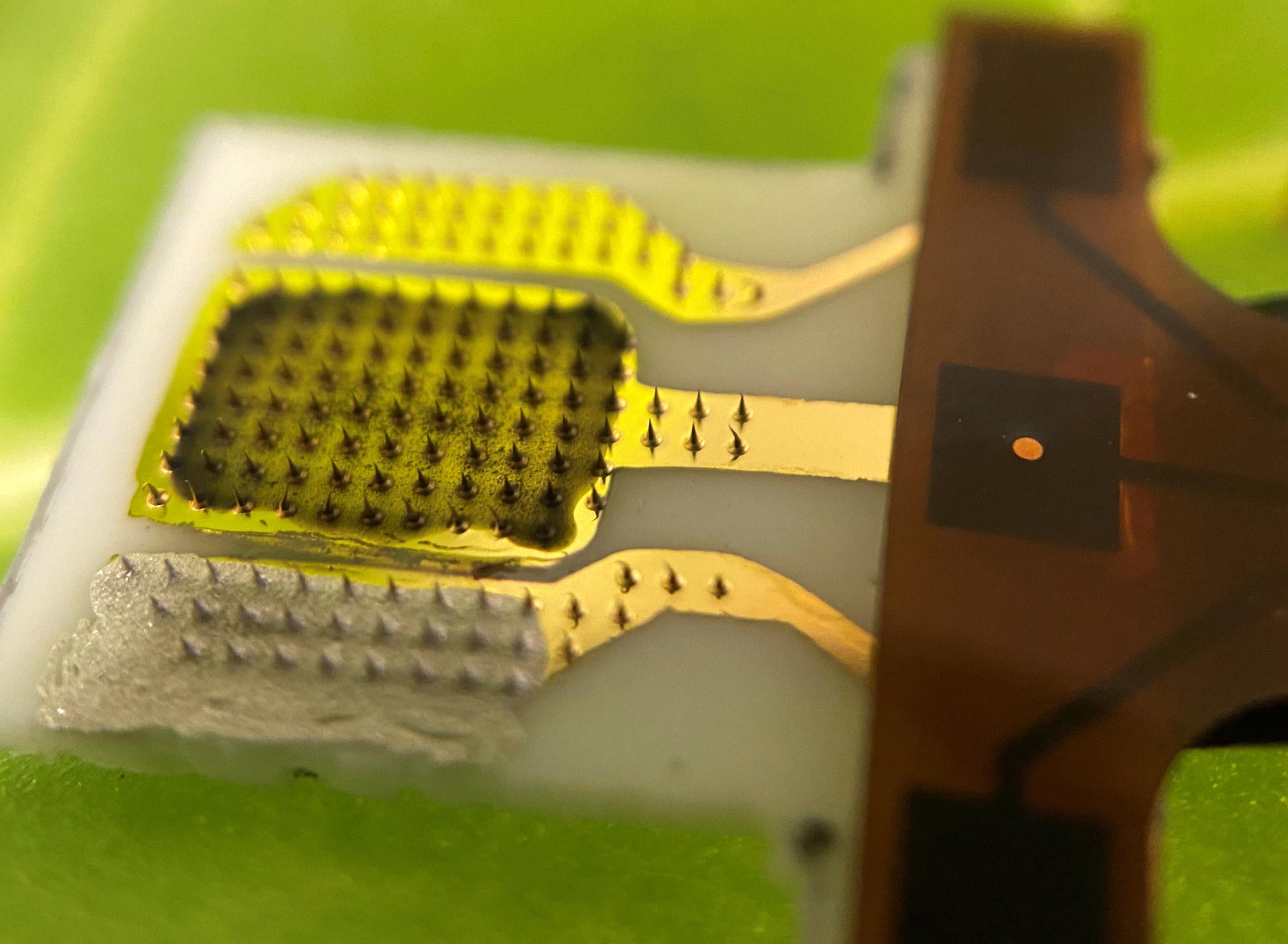 To build a patch that sticks to the underside of leaves, the researchers created an array of microscopic plastic needles across a flexible base. Onto this patterned surface they coated a chitosan-based hydrogel mixture that converted small changes in hydrogen peroxide into measurable differences in electrical current. The mixture contained an enzyme that reacted with hydrogen peroxide to produce electrons and reduced graphene oxide to conduct those electrons through the sensor.